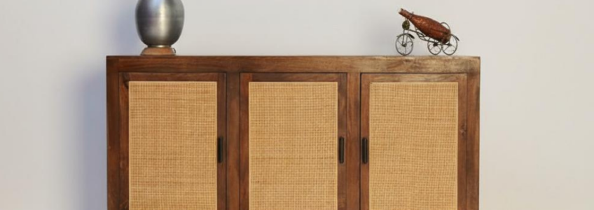 Diamond Carved Brass-Fitted 3-Door Sideboard – a perfect mix of elegance and utility. Featuring intricate diamond-pattern carvings, hand-embossed brass panels, and a brass-laid top for decorative purposes, it offers ample storage with shelves inside for dinnerware, linens, or other essentials.