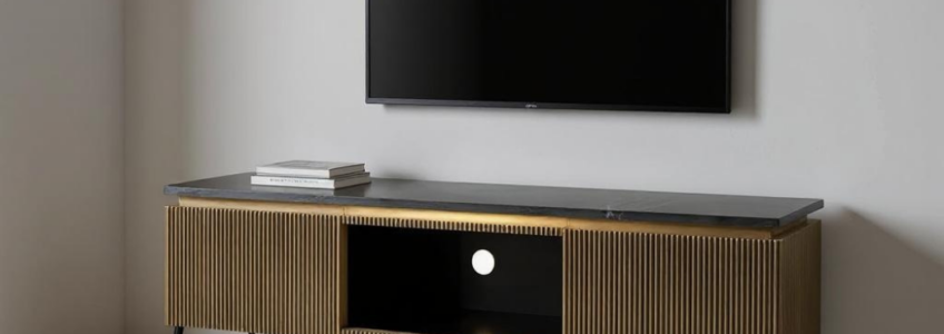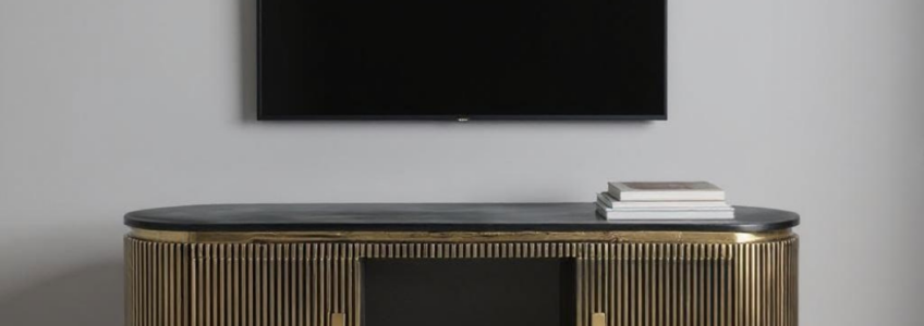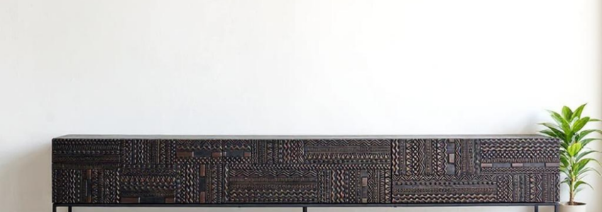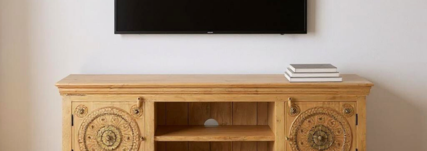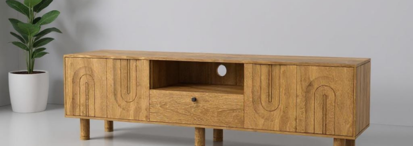 Handcrafted from solid mango wood, this TV unit features intricate hand-carved detailing across its front panels, adding a touch of artisanal charm. Its sleek silhouette, dark finish, and sturdy metal legs blend traditional craftsmanship with modern design—perfect for elevating any living room space.